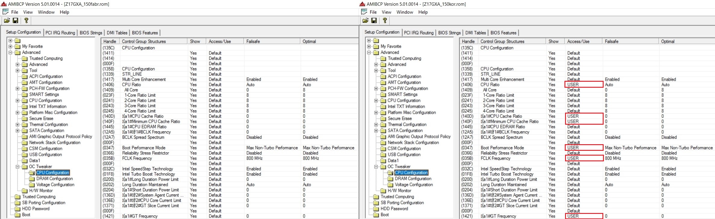 Jedyne różnice to przestawione wartości z Default na USER w kilku wierszach w zakładce Advanced/OC Tweaker/CPU Configuration.