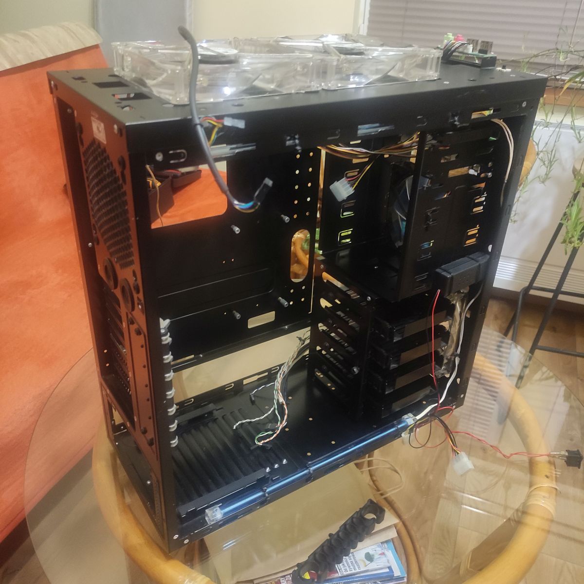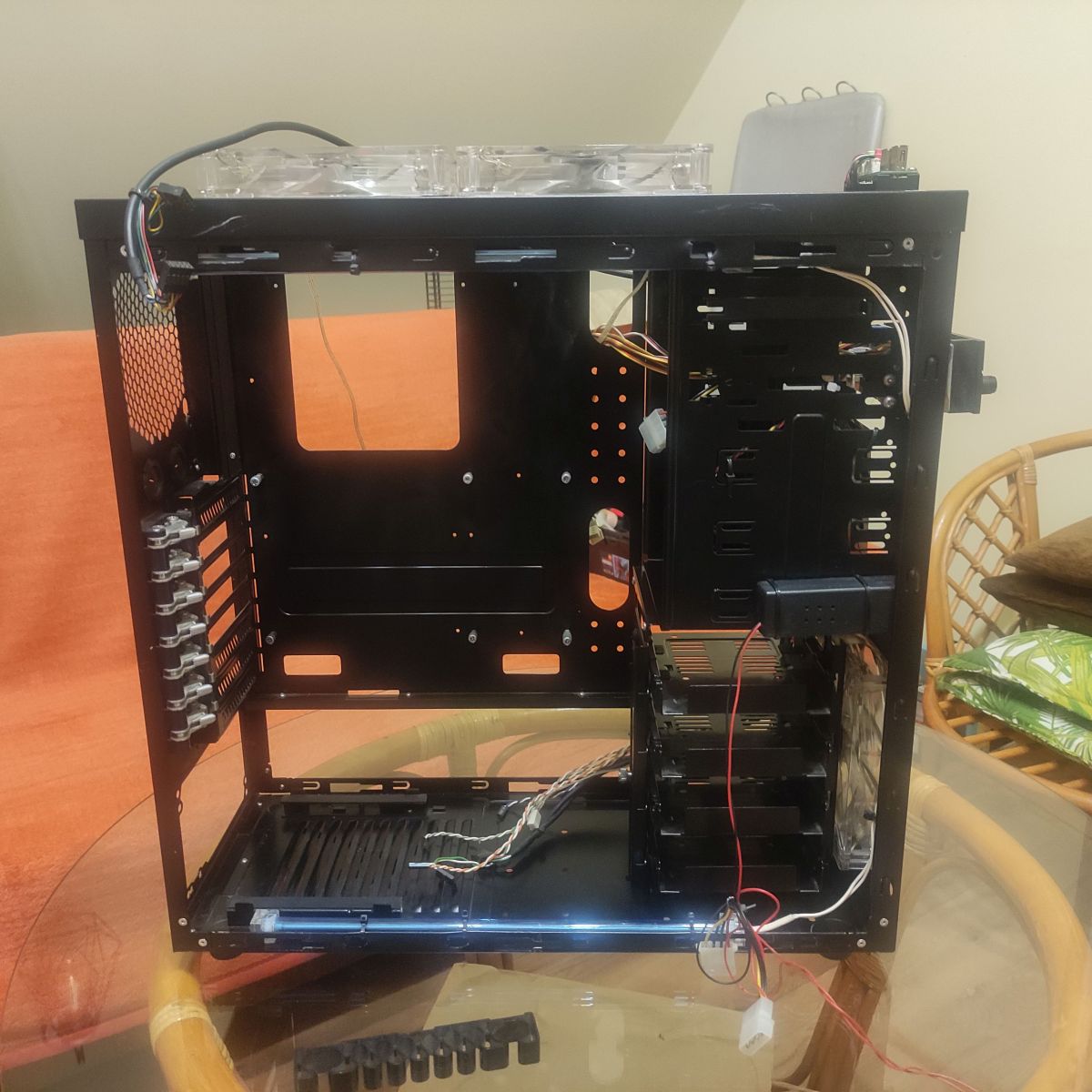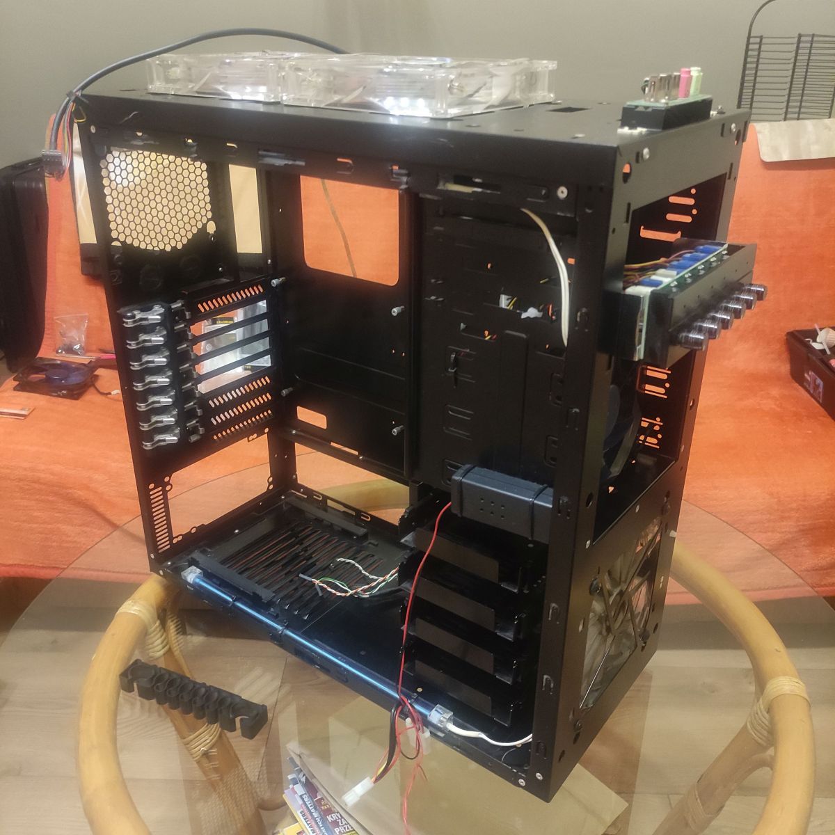 To BĘDZIE maszynka zbudowana z części z szuflady. Jak na razie widać obudowę, taką trochę starszą ale jednak. Wyczyściłem ją, odkręciłem co trzeba, poobcinałem jakieś resztki trytytek i innego badziewia. Jak widzisz są wentylatory fabryczne, 3 sztuki. Mają one rozmiar 140mm i świeciły na niebiesko zanim stało się to modne. Jest też jeden wentylator od Xigmateka, również świecący na niebiesko, jednak zupełnie inaczej (jest to wentyl dodatkowy gdyż ten fabryczny blokowany jest przez koszyk). Widać wreszcie dwie zimne katody CCFL - jak myślisz, w jakim kolorze świecące?