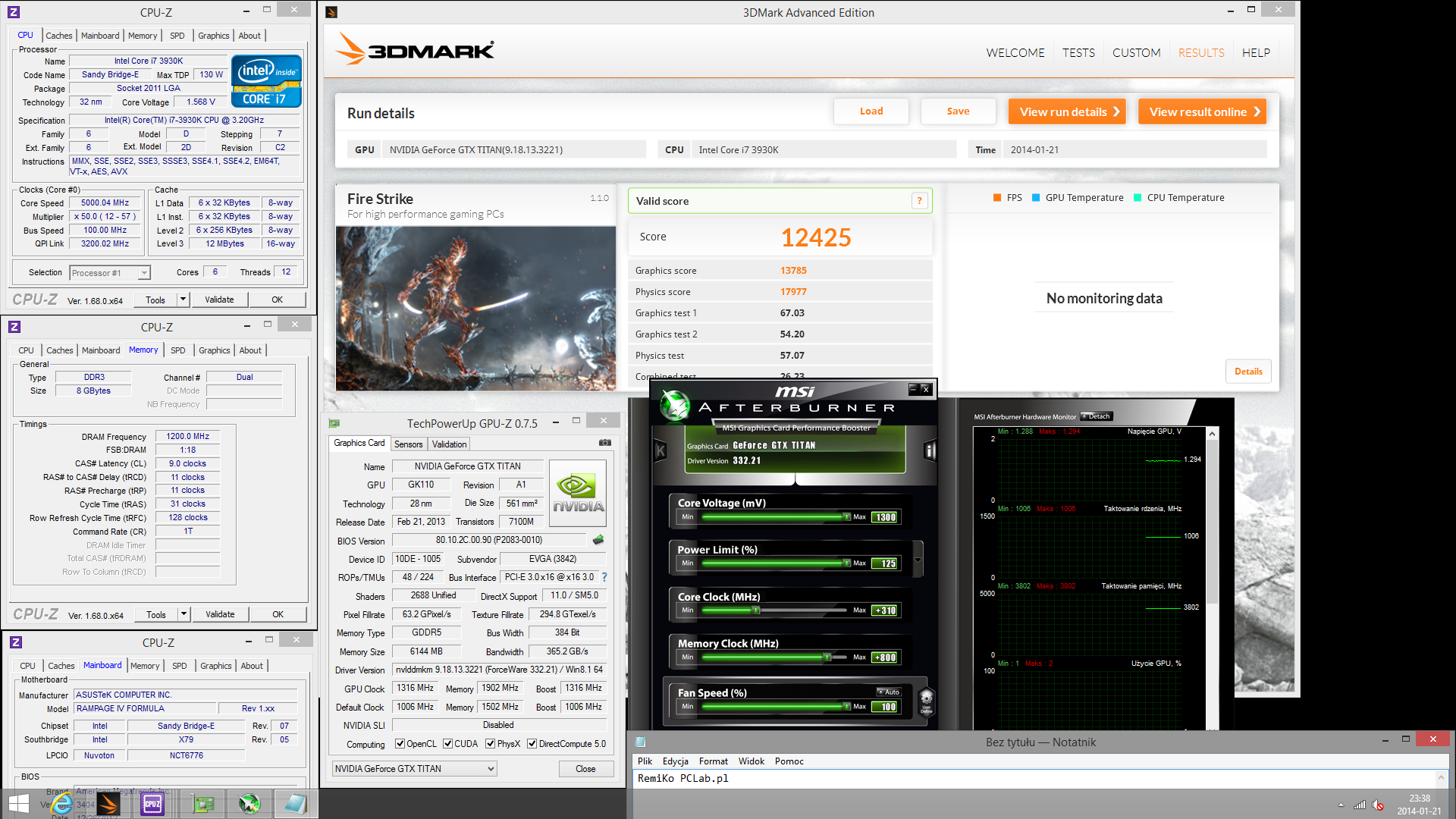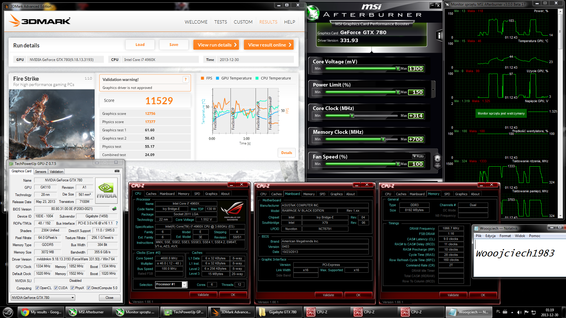"Na screenie obowiązkowo muszą się znaleźć screen z wynikiem testu Fire Strike a na nim GPU-Z, CPU-Z, notatnik z nickiem użytkownika oraz zakładka monitoringu (Afterburner/Evga Precision/GPU Tweak itp.) na której widoczne są zegary rdzenia oraz pamięci w trakcie trwania testu. Zegary dają informację jak wysoko udało się podkręcić kartę użytkownikowi więc aby ta informacja była prawdziwa wymogiem jest monitoring. Bez monitoringu można podać oszukane lub błędne zegary. Dlatego nie podajemy zegarów z GPU-Z, tylko z zakładki monitoringu. Notatnik ma na celu ograniczenie prób oszukiwania np. ktoś znajdzie screen w necie i wrzuci jako swój. Proponuje stosować się do layoutu jaki jest na moim screenie z wynikiem, dzięki temu screeny będą ujednolicone."