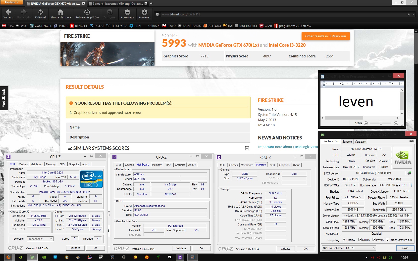 Na screenie powinny się znaleźć screen z wynikiem testu Fire Strike, GPU-Z, CPU-Z oraz notatnik z nickiem użytkownika który ma na celu ograniczenie prób oszukiwania np. ktoś znajdzie wynik w necie i wrzuci jako swój.